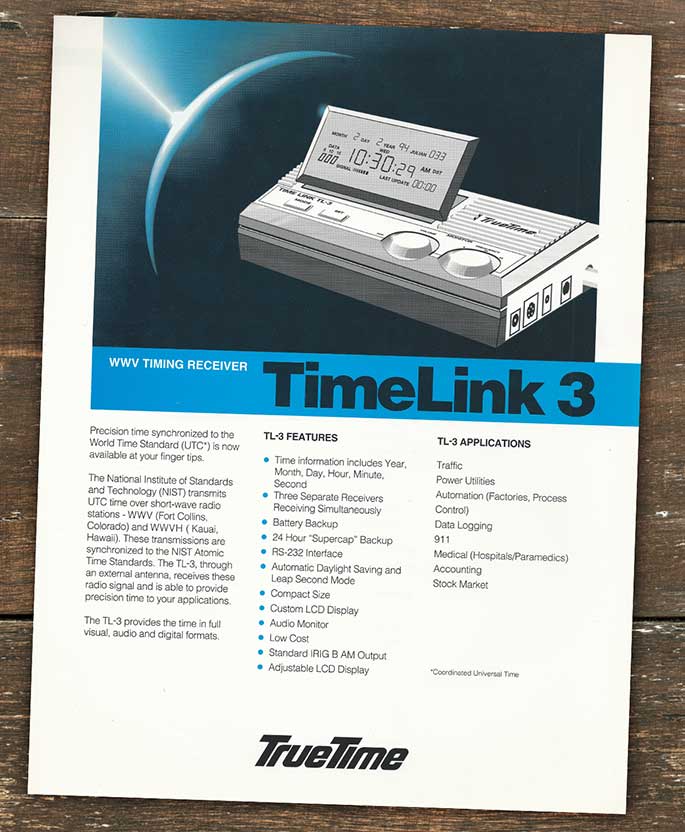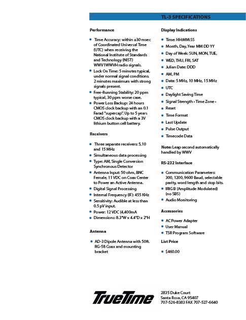 True Time This technical specification datasheet is for a manufacturer of precision time and frequency signal-generating electronics. The technical specifications, features and applications are presented in an easy to scan format providing complete list of relevant technical data. The otherwise dry recitation of technical content is relieved by a three dimensional rendering of the unit.