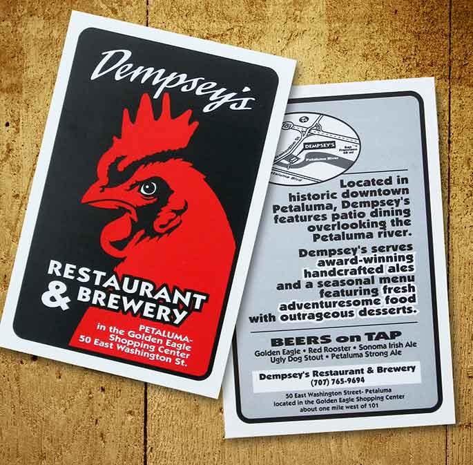 Dempsey's Brewpub Sonoma County's oldest brewpub, also features fine dining. The bold black and red illustration refers to Dempsey's popular Red Rooster Ale. From a direct mail campaign.