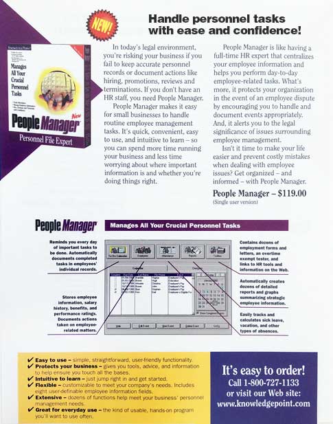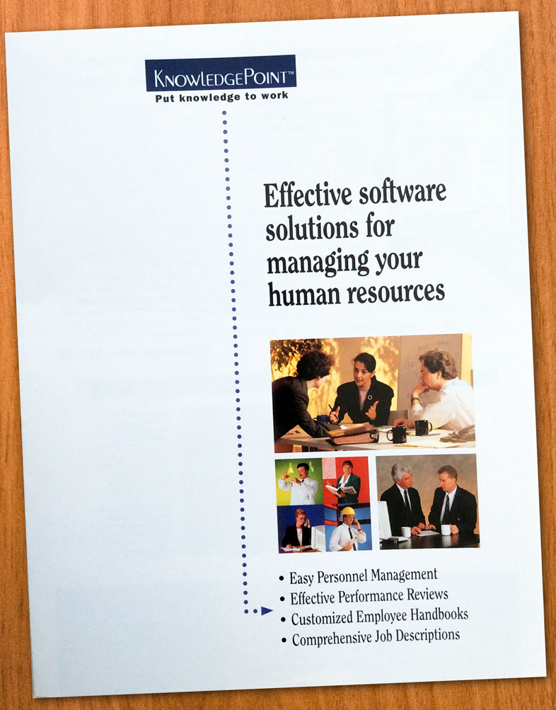 KnowledgePoint, Inc. This direct mail brochure is for a comprehensive suite of human resources software solutions, including writing job descriptions, personnel policies and employee reviews.