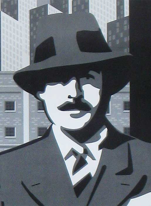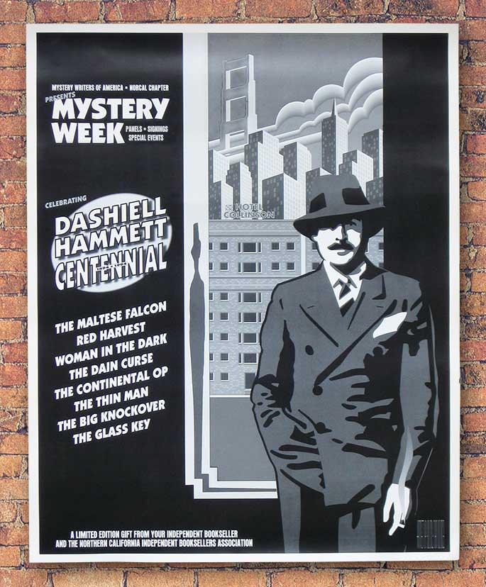 Mystery Writers of America This event poster celebrates the 100th year anniversary of mystery writer Dashiell Hammett. Appropriate to the mystery theme, the illustration features easter eggs and hidden perspective anamorphic images.