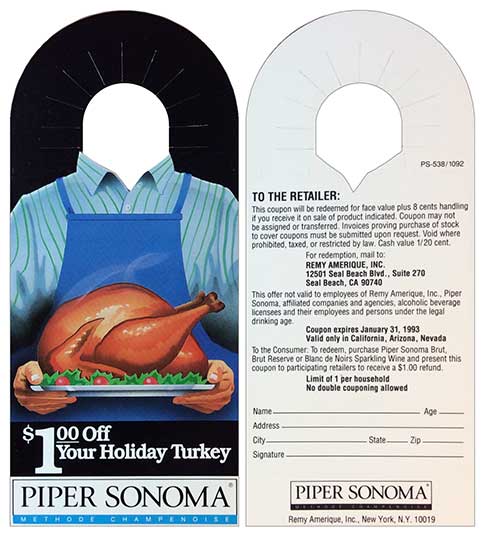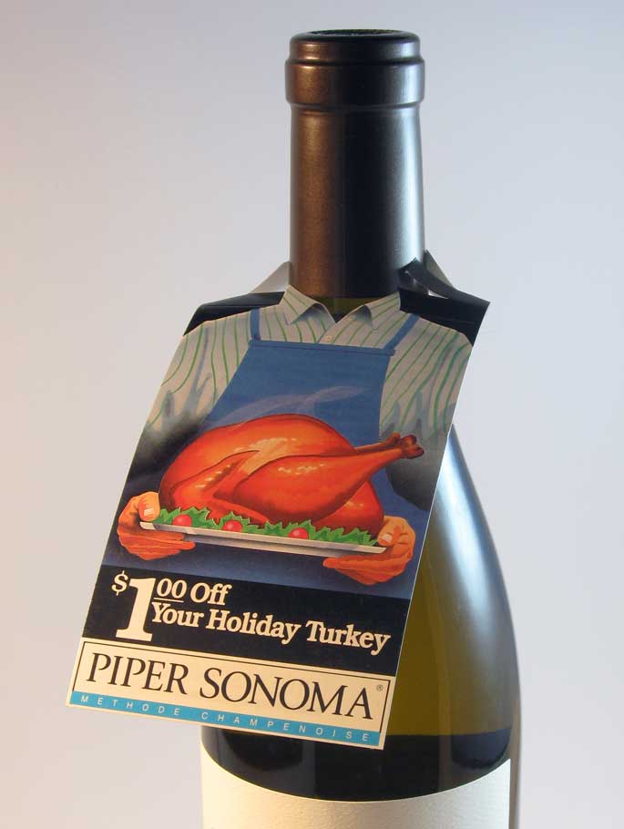 Piper Sonoma This whimsical design and illustration is a playful and tasteful take on the bottle necker concept, complementing this hospitable holiday point-of-purchase wine bottle tag.